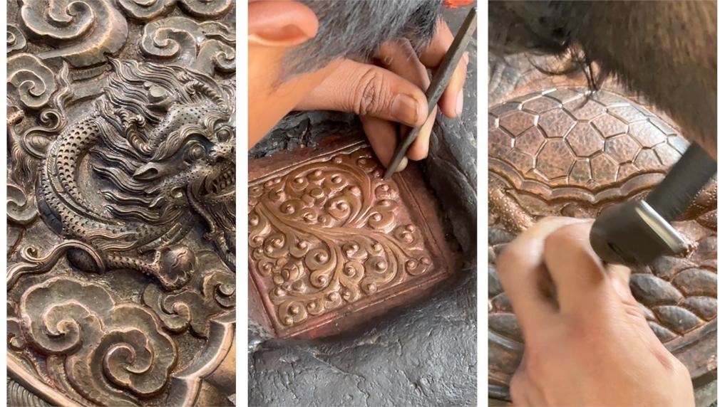 所謂錘揲法,是以銅片或金銀板片為原料,使用鐵臂、鐵套、榔頭、鏨子等工具,敲打出浮雕紋樣、各類造像、建筑裝飾等,對工匠造型能力與經驗要求很高。