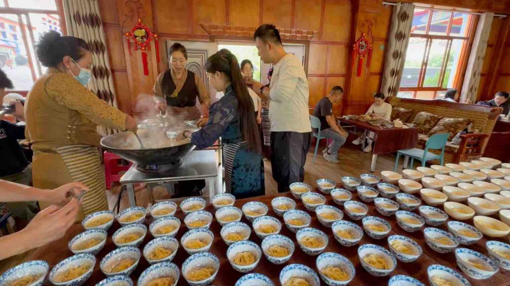 “目前店里紀錄保持在147碗。”在納西民族鄉(xiāng)經營果拉叢農家樂的果拉卓瑪說,“但生活再好也不能浪費。我們會提醒客人,如果吃飽了,只需用筷子在碗上搭出尖尖,就會停止加面;但對于不搭筷子的客人,我們還會再勸一碗。”