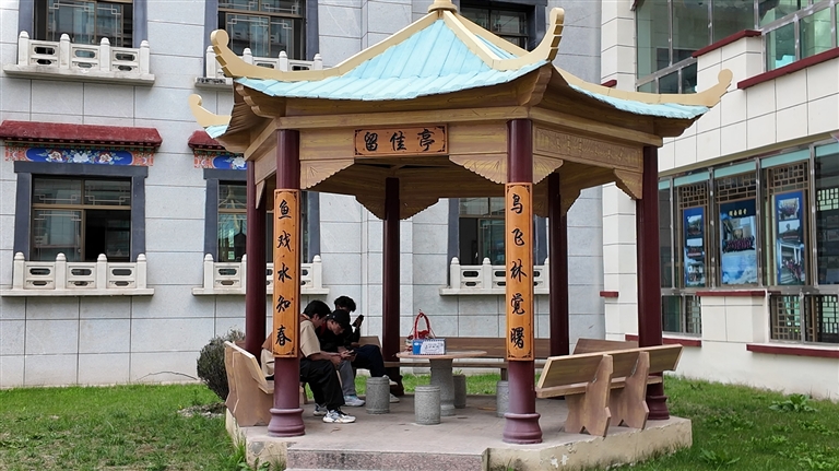 學(xué)生正在校園內(nèi)的涼亭里讀書(shū)。