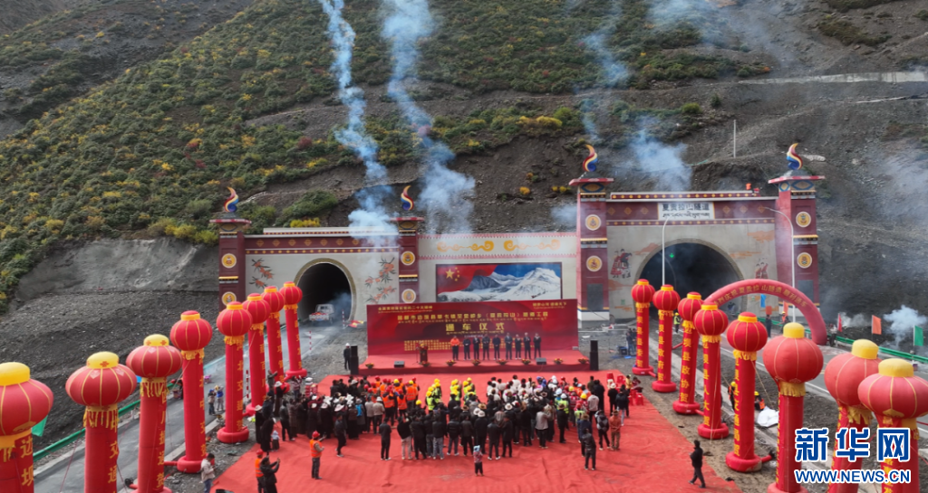 這是夏貢拉山隧道通車儀式現(xiàn)場(chǎng)(9月29日攝,無人機(jī)照片)。新華社發(fā)