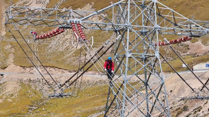 于是在接下來的幾天,記者跟隨著青藏聯(lián)網(wǎng)工程線路年檢工作人員沿著檢修輸電線路從拉薩市林周縣出發(fā)到那曲市安多縣境內(nèi),在此期間,記者經(jīng)歷了一年四季的天氣變化。9月20日,在青藏聯(lián)網(wǎng)工程西藏側(cè)林周段年檢現(xiàn)場2329號(hào)塔位,2名檢修人員正在40多米的高空檢查絕緣子、金具、導(dǎo)地線、引流板和間隔棒。與此同時(shí),“電力天路”上還有15名國網(wǎng)西藏電力輸電線路檢修人員同步穿梭在鐵塔與銀線之間,開展年度檢修作業(yè)。