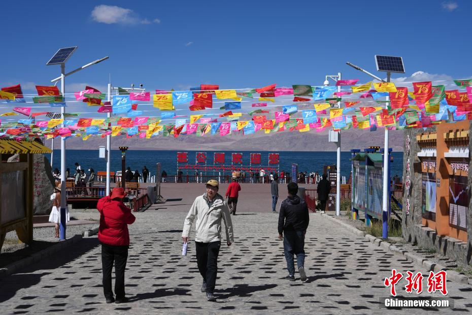 10月4日,游客在班公湖畔游玩?!笆弧眹鴳c假期,西藏日土縣班公湖吸引不少游客觀光游覽。中新社記者 崔楠 攝