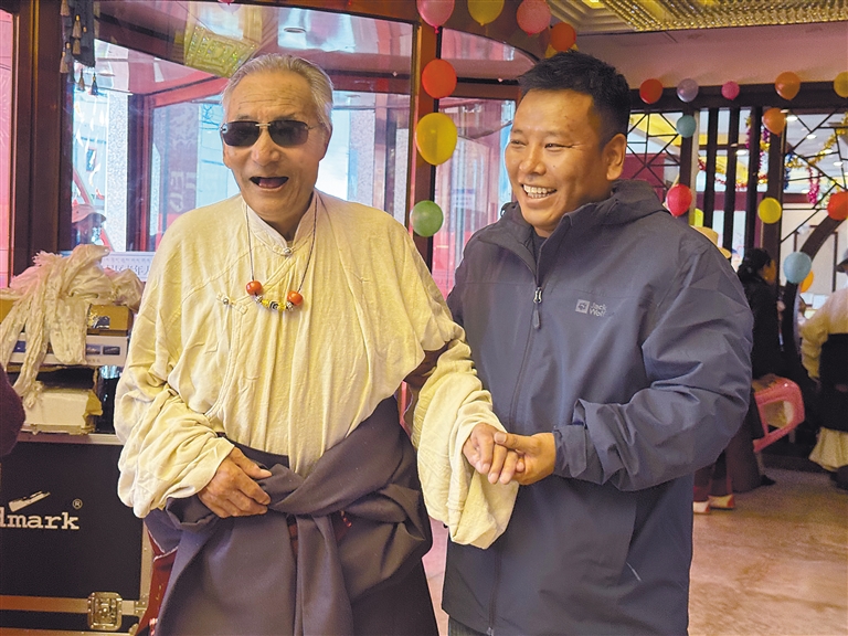 尼瑪是國家級(jí)非物質(zhì)文化遺產(chǎn)代表性項(xiàng)目卓舞(瓊結(jié)久河卓舞)國家級(jí)代表性傳承人。演出中,他擔(dān)任“卓本”(領(lǐng)舞者)角色,協(xié)調(diào)整個(gè)團(tuán)隊(duì)11人的舞蹈動(dòng)作和節(jié)奏?!拔矣H歷西藏翻天覆地的變化,看到如今的盛世,叫我們?cè)跄懿桓璩?!”面?duì)人們對(duì)他不顧年事“執(zhí)著”舞臺(tái)的疑問和驚嘆,尼瑪感嘆道。