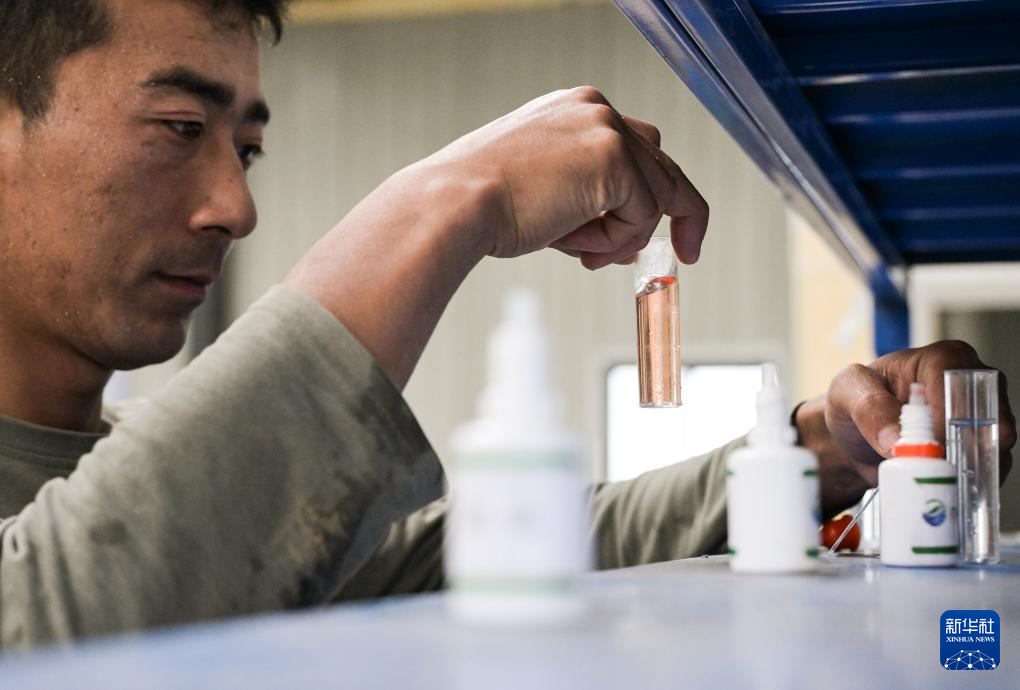 在西藏林芝市米林農(nóng)場的粵林高原漁業(yè)科技園工作的藏族小伙尼瑪旺堆在冷水魚養(yǎng)殖大棚內(nèi)檢測水樣(10月24日攝)。新華社記者 李賀 攝