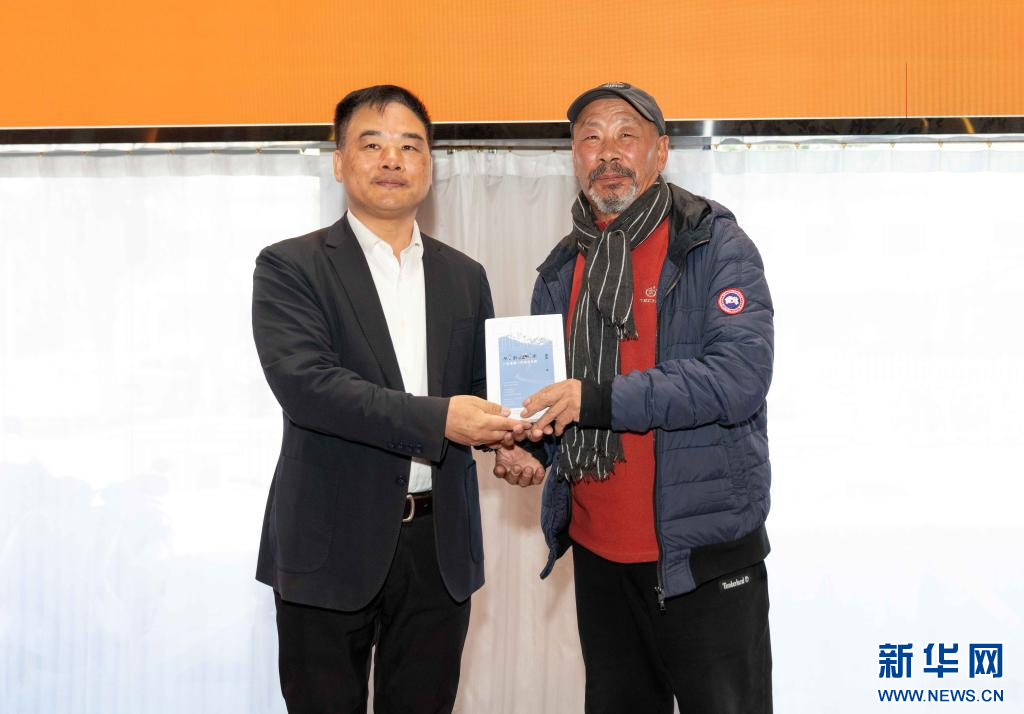 作者余風(fēng)(左)向蒞臨的嘉賓贈書留念(11月9日)。新華社記者 旦增尼瑪曲珠 攝