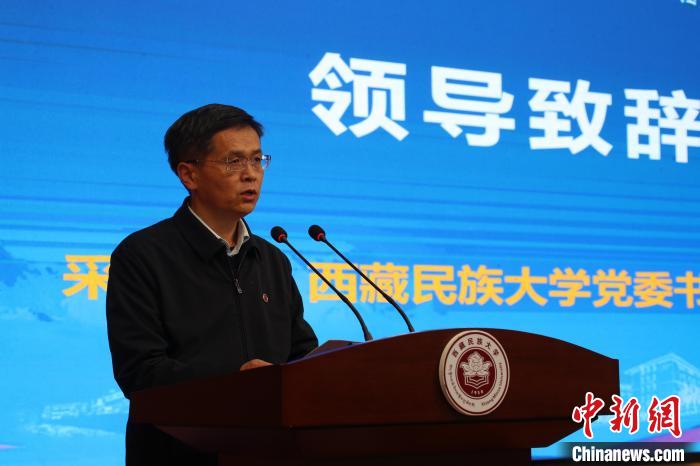 西藏民族大學(xué)黨委書(shū)記、副校長(zhǎng)采守寬在第四屆“藏秦·喜馬拉雅”論壇開(kāi)幕式發(fā)表致辭。主辦方供圖