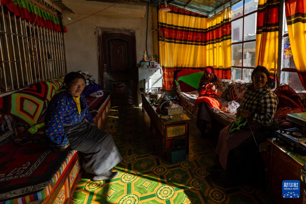 措勤縣扎日南木錯(cuò)社區(qū)居民曲珍(右)在溫暖的家中與姐妹一起做手工(11月20日攝)。新華社記者 姜帆 攝
