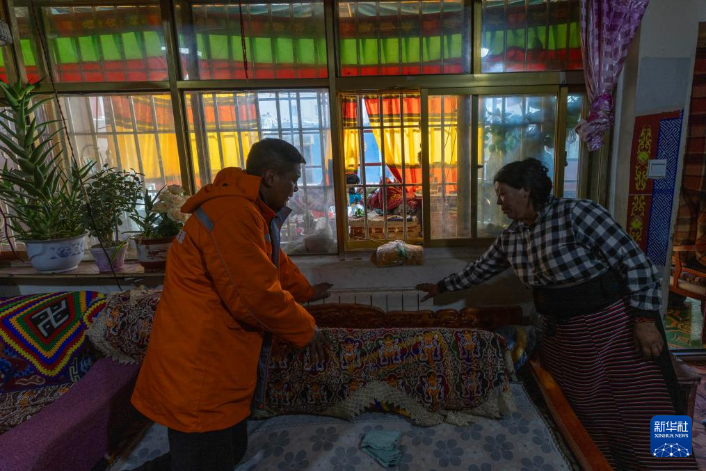 措勤縣城區(qū)清潔能源集中供暖特許經(jīng)營項(xiàng)目工作人員次旺羅布(左)在扎日南木錯(cuò)社區(qū)居民曲珍家查看供暖情況(11月20日攝)。新華社記者 姜帆 攝