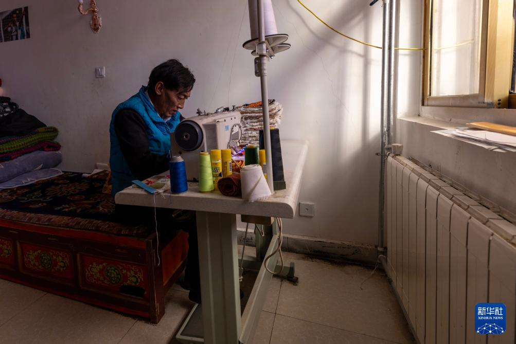 措勤縣扎日南木錯(cuò)社區(qū)居民林瓊在自家的暖氣房內(nèi)制作傳統(tǒng)民族帽飾(11月20日攝)。新華社記者 姜帆 攝