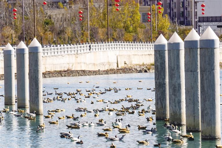 開(kāi)闊的河面上,斑頭雁、黃鴨、赤麻鴨等鳥(niǎo)類(lèi)往來(lái)于此,此起彼伏的叫聲不絕于耳。在陽(yáng)光的照射下水面波光粼粼,候鳥(niǎo)或嬉游、或覓食、或追逐,這一和諧優(yōu)美的景象,引得不少觀賞的市民和游客舉起手機(jī)或相機(jī)記錄。