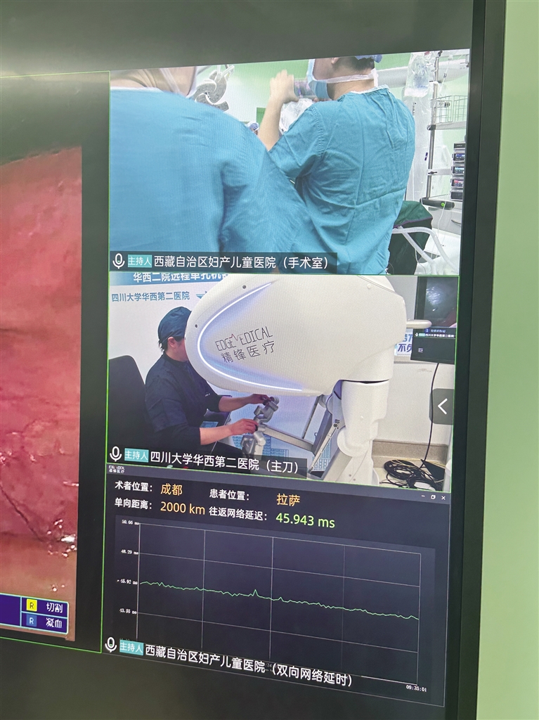 梅玲介紹,此次手術(shù)是與四川大學(xué)華西第二醫(yī)院聯(lián)合開(kāi)展的,由四川大學(xué)華西第二醫(yī)院的鄭瑩教授團(tuán)隊(duì)主刀,并依托華西的先進(jìn)技術(shù)平臺(tái),通過(guò)遠(yuǎn)程方式完成手術(shù)。手術(shù)結(jié)束后,鄭瑩教授通過(guò)視頻向大家介紹,這場(chǎng)跨越2000公里距離與3000米海拔差異的手術(shù),總共用時(shí)1小時(shí)45分鐘,網(wǎng)絡(luò)延遲僅40毫秒?!按舜问中g(shù)的成功為今后更多優(yōu)質(zhì)資源技術(shù)送達(dá)偏遠(yuǎn)地區(qū)提供了重要參考,也為提高西藏醫(yī)療水平打下了堅(jiān)實(shí)的基礎(chǔ)。”鄭瑩說(shuō)。