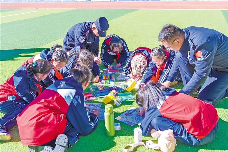 圖為亞?wèn)|出入境邊防檢查站的民警和學(xué)生一同創(chuàng)作“憲法伴我成長(zhǎng)”手抄報(bào)。通訊員 李錦輝 攝