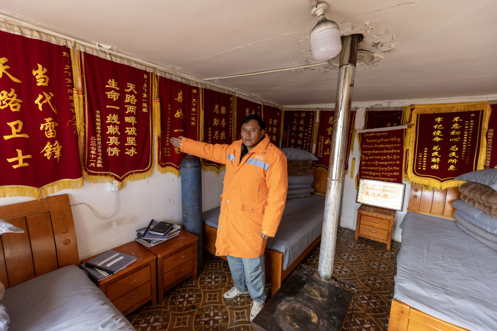 這里的救助站吸引了記者的注意。進入房間,內有床鋪、氧氣瓶、抗高反藥等物品,四面墻上掛滿錦旗。一封毛筆書寫的紅底感謝信格外顯眼,信中表達了對地嘎、東力、次仁多吉三名養(yǎng)路工人的感謝。信中寫道:“在那漫長的10個小時里,你們不顧危險和疲憊,想盡辦法讓我脫險?!?/p>