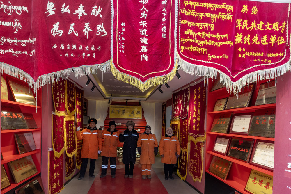養(yǎng)路工人在“天下第一道班”紀念館內合影(12月1日攝)。新華社記者 姜帆 攝