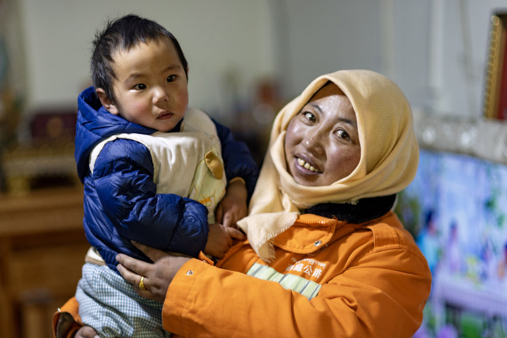 養(yǎng)路工人益西曲珍(右)和一歲多的兒子扎西羅布在“天下第一道班”的職工宿舍中(12月1日攝)。新華社記者 姜帆 攝