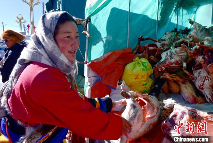 12月6日,西藏自治區(qū)那曲市申扎縣第十八屆畜產(chǎn)品展銷會(huì)現(xiàn)場(chǎng),牧民整理售賣的羊肉。李林 攝