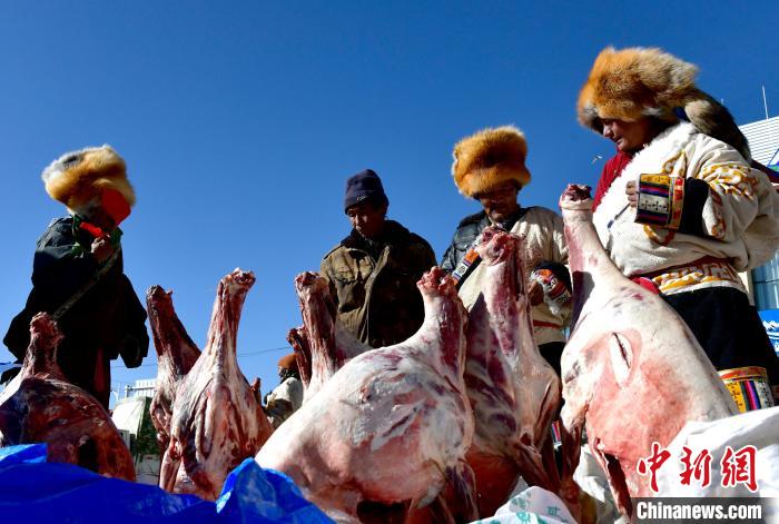 12月6日,西藏自治區(qū)那曲市申扎縣第十八屆畜產(chǎn)品展銷會(huì)現(xiàn)場,民眾挑選羊肉?!±盍?攝