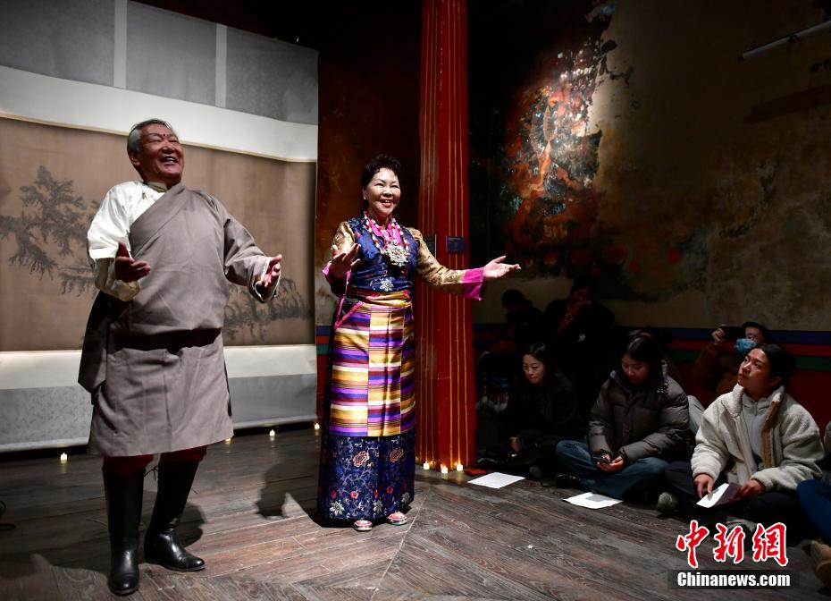 12月23日晚,西藏拉薩吉本崗藝術(shù)中心舉行吉光之夜活動(dòng)。朗瑪堆諧、扎木念彈唱、熱巴舞等非遺展演,吸引眾多民眾共同領(lǐng)略西藏非物質(zhì)文化遺產(chǎn)的無(wú)窮魅力。圖為拉薩堆諧傳承隊(duì)帶來的朗瑪堆諧《扎拉西巴》。中新社記者 李林 攝