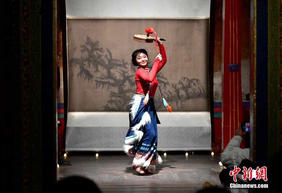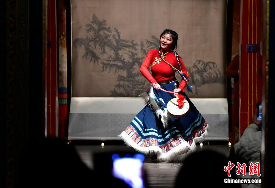 12月23日晚,西藏拉薩吉本崗藝術(shù)中心舉行吉光之夜活動(dòng)。朗瑪堆諧、扎木念彈唱、熱巴舞等非遺展演,吸引眾多民眾共同領(lǐng)略西藏非物質(zhì)文化遺產(chǎn)的無(wú)窮魅力。圖為熱巴舞《太陽(yáng)鼓舞》。中新社記者 李林 攝