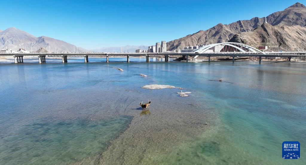 12月23日,兩只亞成體雄性白唇鹿出現(xiàn)在流經(jīng)拉薩城區(qū)的拉薩河中(無人機(jī)照片)。新華社記者 晉美多吉 攝