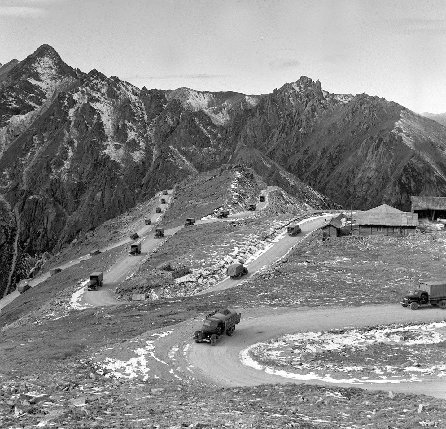 1964年,滿載建設(shè)物資的汽車隊(duì)行駛在川藏公路途中的雀兒山上。