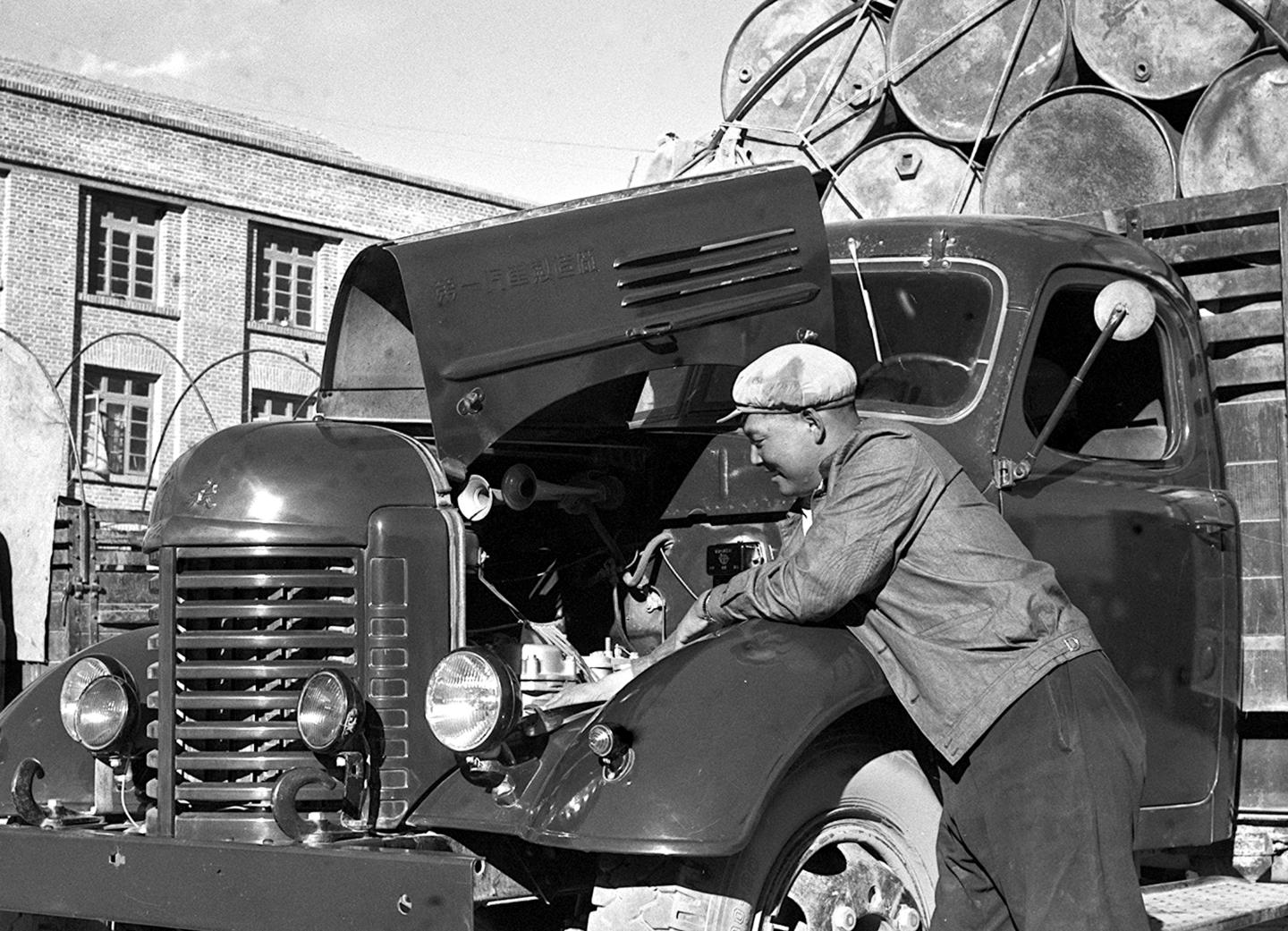1964年,曾經(jīng)是川藏公路筑路工人的汽車駕駛員呷瑪卻桑在出車前對(duì)汽車機(jī)件進(jìn)行檢查。