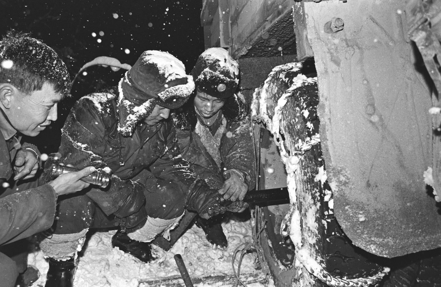 1964年,解放軍一個(gè)汽車連隊(duì)的駕駛員在川藏公路上用洗臉盆端雪去冷卻油泵。