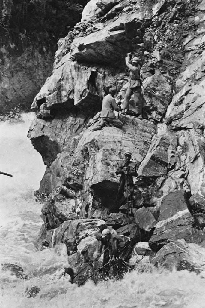 1953年,修筑川藏公路的解放軍戰(zhàn)士在懸崖上勞動(dòng)。
