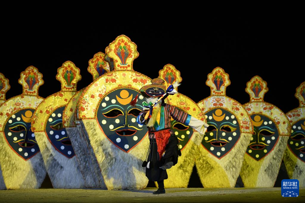 2021年4月10日,演員在大型實(shí)景劇《文成公主》中表演藏戲片段。拉薩布制面具制作技藝西藏自治區(qū)級非遺傳承人西洛創(chuàng)辦的拉薩市達(dá)孜區(qū)雪鄉(xiāng)扎西崗傳統(tǒng)手工藝合作社多次為該劇提供道具支持。新華社記者 孫瑞博 攝