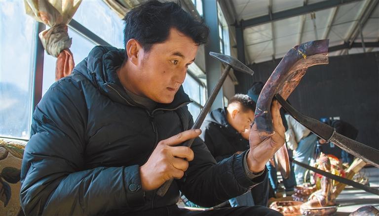 在國家級(jí)非遺孜東銅器作坊,工作人員正在制作銅器。