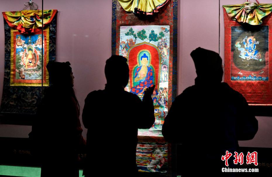 以“見證與守望——鑄牢中華民族共同體意識主題展”為主題的展覽近日亮相西藏自治區(qū)拉薩市布達拉宮珍寶館。本次主題展精選100余件文物珍品,展覽通過文物、古籍及布達拉宮的傳承與發(fā)展,講述各民族交往交流交融的故事。圖為1月2日,觀眾拍攝展覽中的唐卡。中新社記者 李林 攝