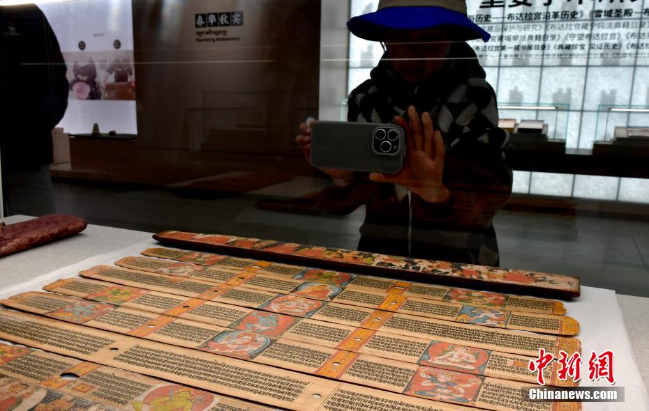 以“見證與守望——鑄牢中華民族共同體意識主題展”為主題的展覽近日亮相西藏自治區(qū)拉薩市布達拉宮雪城珍寶館。本次主題展精選100余件文物珍品,展覽通過文物、古籍及布達拉宮的傳承與發(fā)展,講述各民族交往交流交融的故事。圖為1月2日,觀眾拍攝展覽中的13世紀《般若八千頌》貝葉經(jīng)寫本。中新社記者 李林 攝