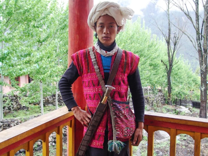僜人服飾分男裝和女裝。男子上身一般穿無(wú)領(lǐng)無(wú)袖長(zhǎng)衫,多為白色和黑色,他們一般用布條纏繞頭部;僜家女性上衣一般織有彩紋,短及胸部,腰部袒露,下著筒裙,筒裙多用彩格布制作。男女均習(xí)慣用大披肩和挎包。