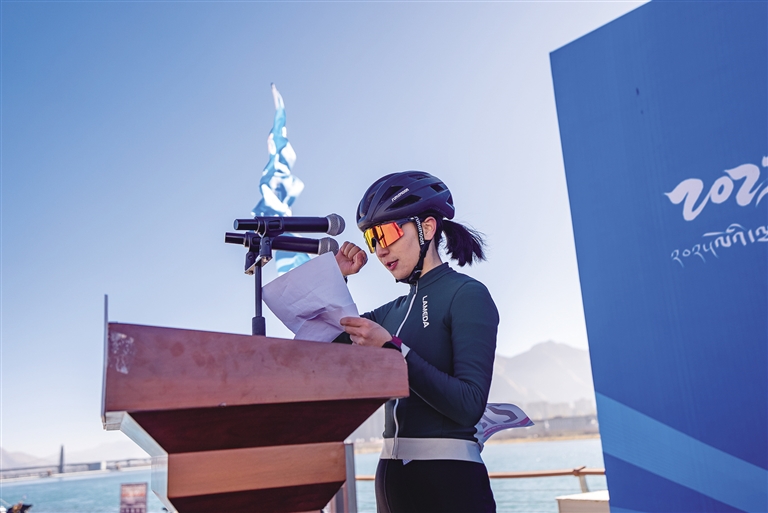 隨著發(fā)令槍響,選手們蹬踏出發(fā),瞬間點燃現(xiàn)場氣氛。經(jīng)過激烈角逐,各個組別的冠軍相繼產(chǎn)生。女子組冠軍由拉薩老隊員車隊的白瑪央吉摘得。“獲得第一名,我感到非常榮幸和開心。這個賽道設計得非常有挑戰(zhàn)性,沿途風景如畫。這是我騎車的第五年,感謝主辦方提供了這個平臺,讓我有機會與全國各地的優(yōu)秀選手同臺競技,同時也要感謝我的隊友和教練的支持和鼓勵?!卑赚斞爰拥卣f。