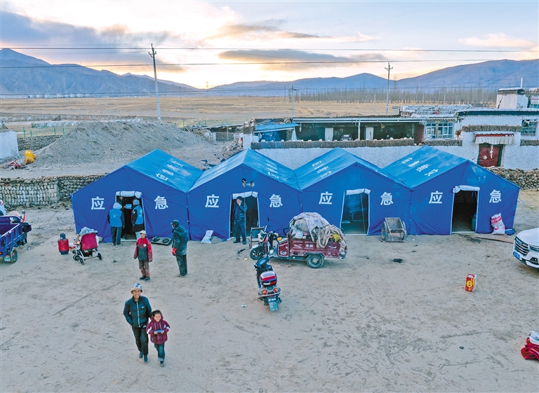 圖為1月7日,在拉孜縣曲下鎮(zhèn)土林村,受災(zāi)群眾搬入應(yīng)急帳篷(無人機照片)。新華社記者 姜帆 攝