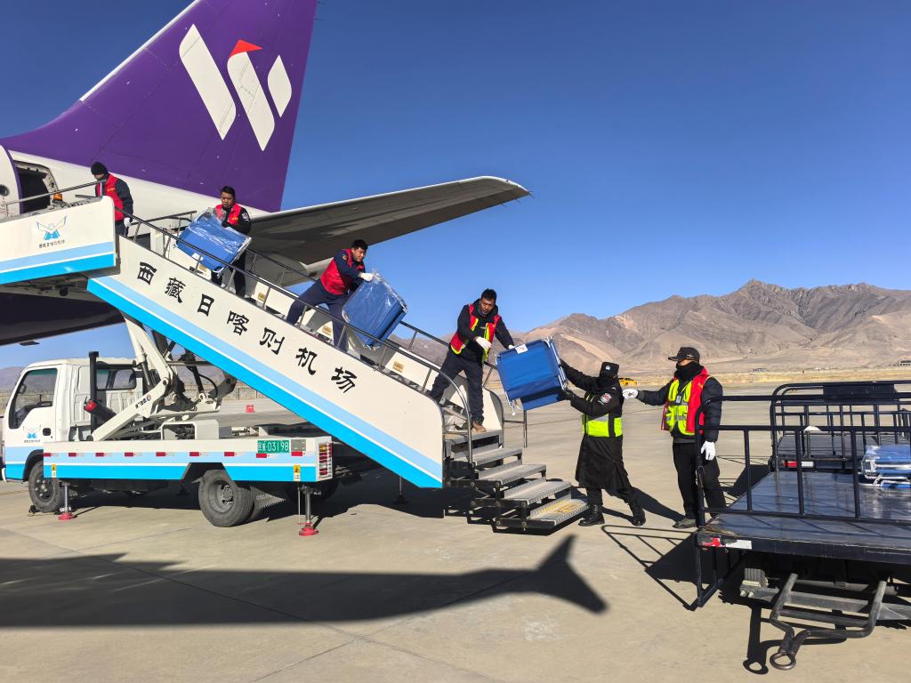 1月9日上午,救援物資抵達(dá)西藏日喀則機(jī)場(chǎng)。新華社發(fā)