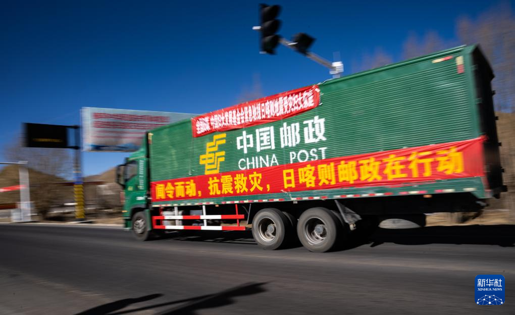 2025年1月8日,在日喀則,中國郵政的抗震救災(zāi)物資運(yùn)輸車輛向震中方向駛?cè)?。新華社記者 丁增尼達(dá) 攝