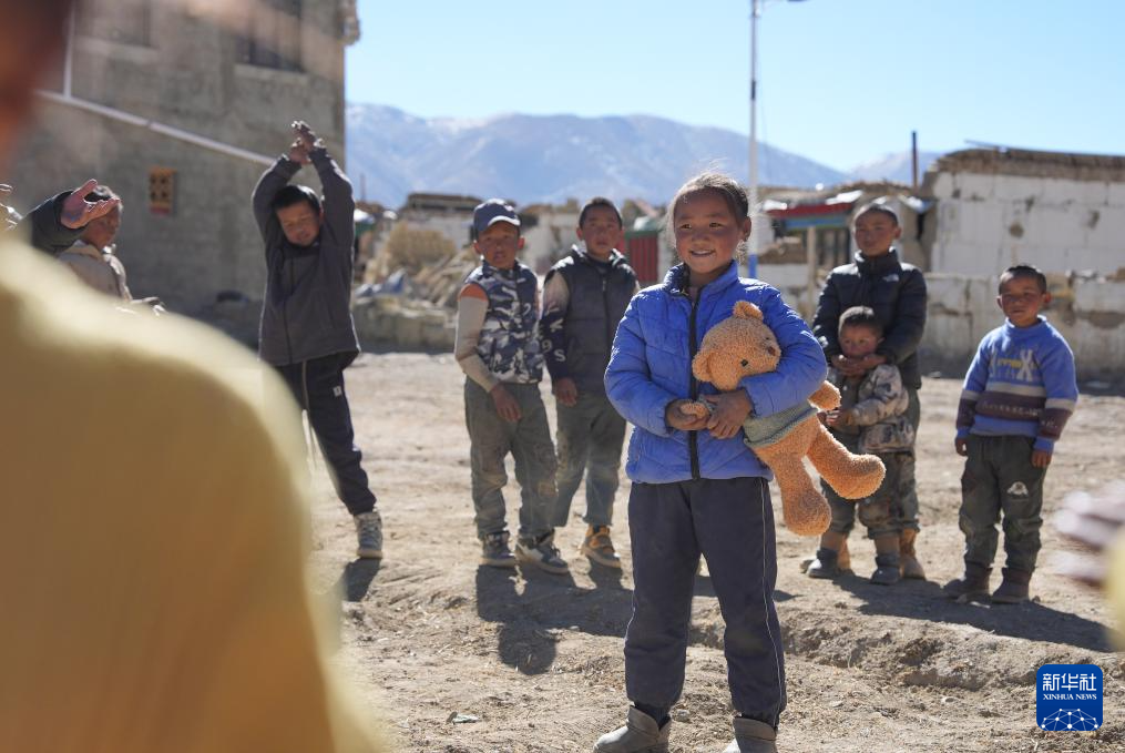 2025年1月8日,在日喀則市定日縣措果鄉(xiāng)塘仁村地震災(zāi)后安置點(diǎn),工作人員向孩子們贈送玩偶熊,并給他們表演節(jié)目。新華社記者 晉美多吉 攝
