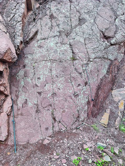 西藏昌都位于青藏高原東部,據(jù)介紹,此研究區(qū)的侏羅紀(jì)地層最大厚度超過4800米,巨大的沉積厚度促進了大量化石的發(fā)現(xiàn),其中就包括恐龍足跡化石。2023年7月,中國地質(zhì)調(diào)查局自然資源實物地質(zhì)資料中心項目組于昌都開展工作時,在凍多村一段鄉(xiāng)村道路兩側(cè)的石壁上發(fā)現(xiàn)了疑似爬行動物腳印,隨即與遺跡學(xué)專家合作組成考察隊開展研究。該足跡化石點頂部為灰?guī)r,由紫紅色砂巖間夾頁巖、黏土巖組成,含有植物化石、遺跡化石和少許腕足、介形類和海百合莖等化石,總體屬于海陸交互環(huán)境??疾礻犜诳铸堊阚E所在層面與相鄰層面還發(fā)現(xiàn)了如古藻跡、石針跡等遺跡,這些發(fā)現(xiàn)代表這個地方曾是淺水環(huán)境。因此,研究證明,良好的環(huán)境和豐沛的水資源吸引了恐龍等動物在此活動,并留下豐富的足跡化石。