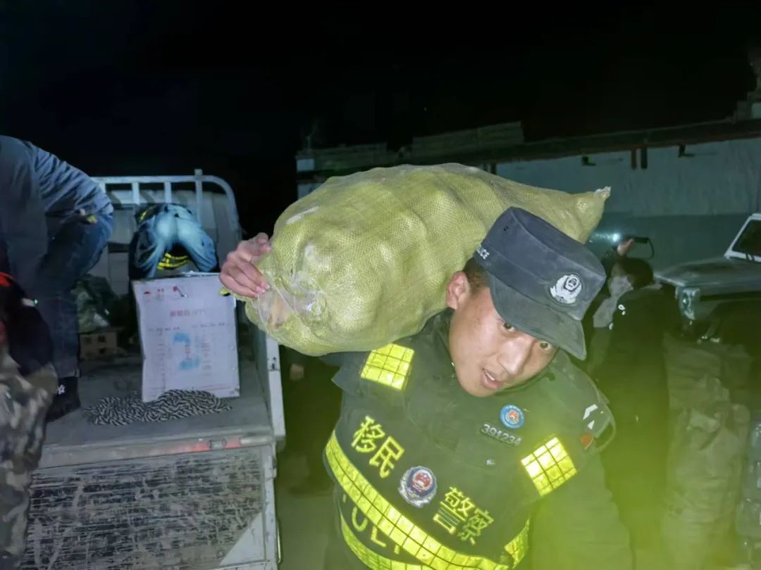 圖為在日喀則市定日縣長所鄉(xiāng)雜村安置點(diǎn),日喀則邊境管理支隊(duì)雜村“帳篷警務(wù)室”民警搬運(yùn)物資。蘇恒 攝