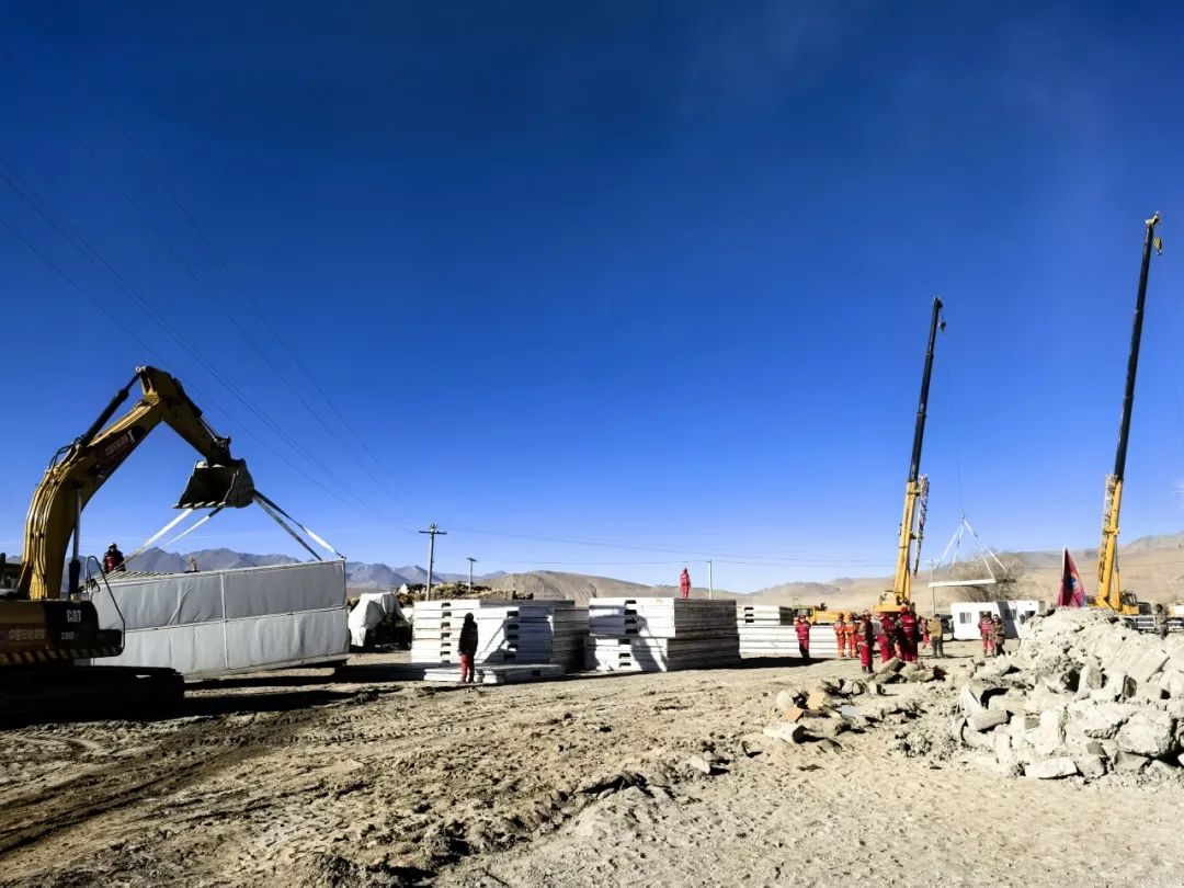 圖為在日喀則市定日縣長所鄉(xiāng)玉白村安置點(diǎn),工作人員正在吊裝板房。平措塔杰 攝