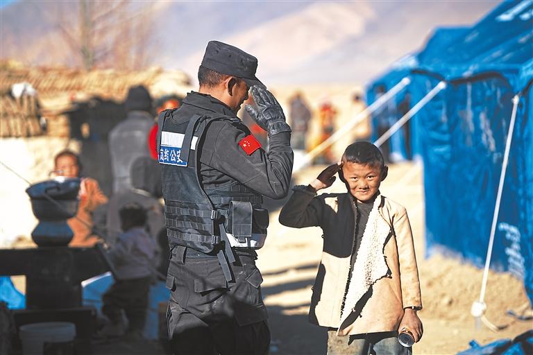 “照片上的這位民警是我們的同事,叫普次仁。1月9日,他在村里的臨時安置點(diǎn)巡邏的時候,看到一個小男孩,便將自己手中的飲料遞給他。沒想到這個叫達(dá)瓦扎西的小男孩很認(rèn)真地給他敬了個禮。”定結(jié)縣公安局應(yīng)急救援小分隊隊員高靜說,“照片是我在定日縣措果鄉(xiāng)吉翁村拍的?!?/p>