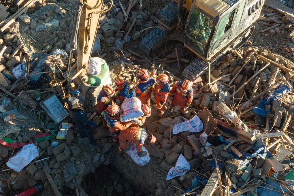 1月13日,在定日縣長所鄉(xiāng)古榮村,消防員們在整理從廢墟中搶救出的青稞(無人機(jī)照片)。新華社記者丁增尼達(dá) 攝