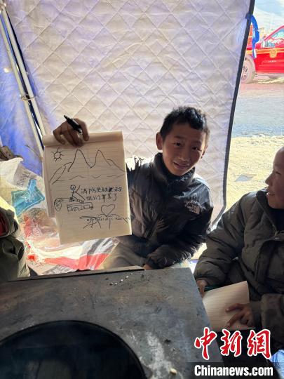 多吉擔(dān)心地震給孩子們帶來心理陰影,為了讓他們樂觀度過這段時間,多吉整理了單位用來存放物資的帳篷作為畫畫的地方,又特意托加油站工作人員為孩子們購買了彩筆和畫本。