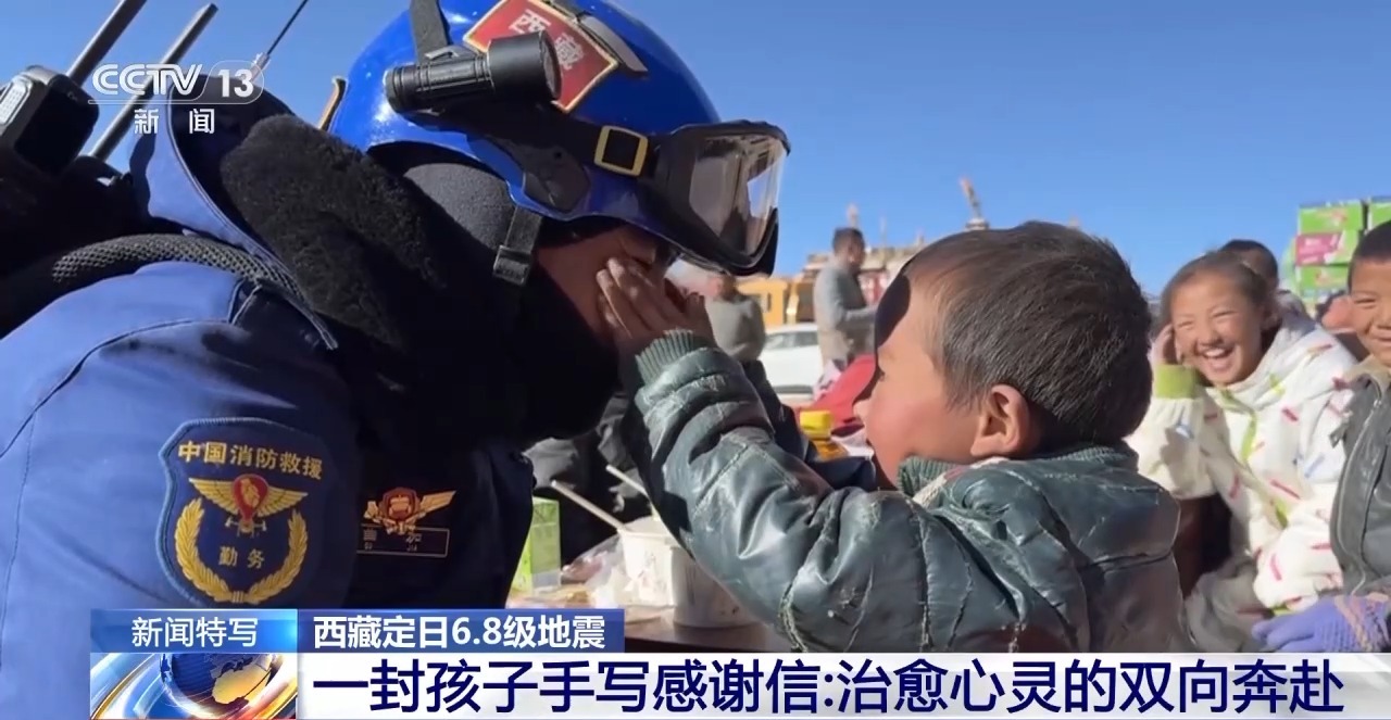西藏森林消防總隊教育宣傳處助理員 鄭龍:能感覺到孩子在地震里受到的驚嚇正在慢慢減少,還會主動過去找消防員玩,主動“受領任務”,幫忙搬運物資。