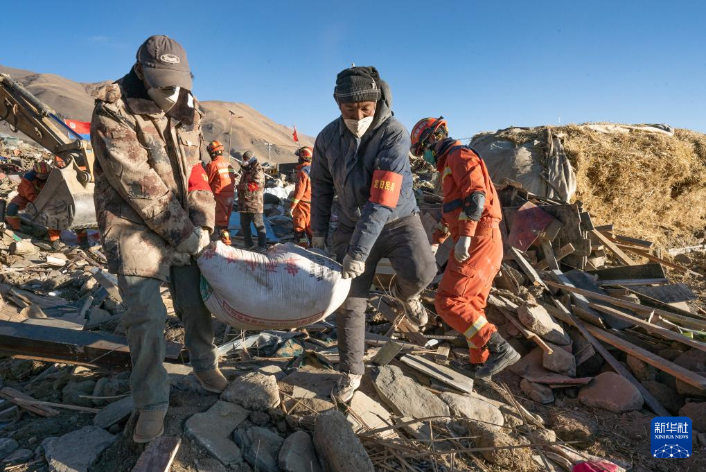 1月13日,在定日縣長所鄉(xiāng)古榮村,消防員在搬運搶救出來的青稞。新華社記者 丁增尼達 攝