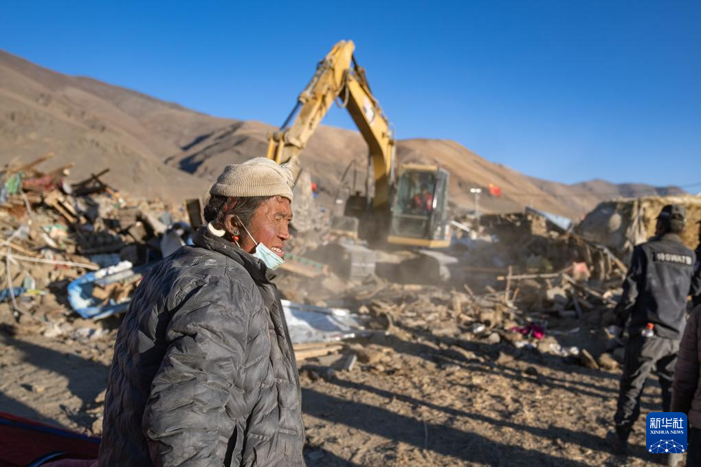 1月13日,在定日縣長所鄉(xiāng)古榮村,次仁扎西老人站在自家的廢墟前。新華社記者 丁增尼達 攝