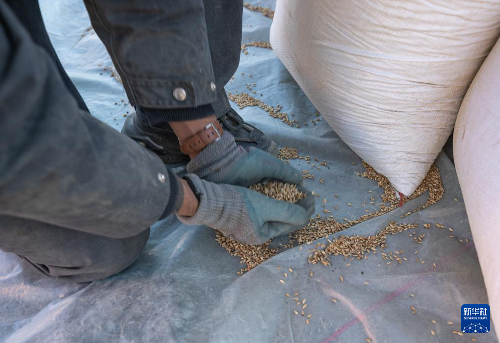 1月13日,在定日縣長所鄉(xiāng)古榮村,次仁扎西老人在整理搶救出來的青稞。新華社記者 丁增尼達 攝