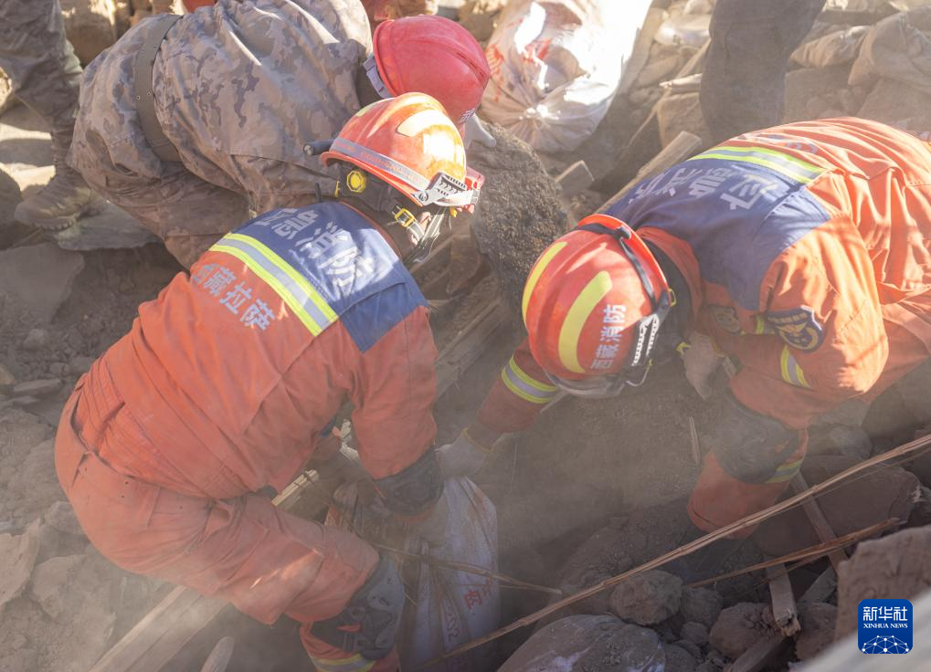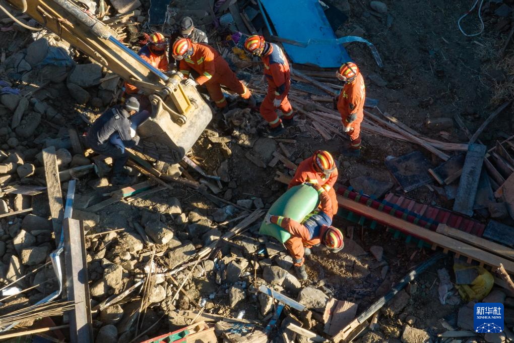 1月13日,在定日縣長所鄉(xiāng)古榮村,消防員、武警官兵和公安干警在搜尋次仁扎西老人家里的青稞。新華社記者 丁增尼達 攝