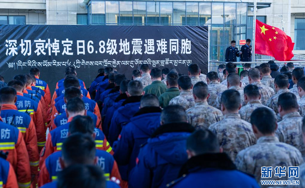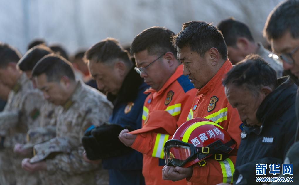 1月13日上午9時30分,西藏定日6.8級地震遇難同胞悼念儀式在受災(zāi)最嚴(yán)重的長所鄉(xiāng)舉行。參與救援的解放軍和武警官兵、消防救援人員、公安民警、醫(yī)護人員、青年志愿者及有關(guān)企業(yè)員工、干部職工、震區(qū)群眾代表數(shù)百人,脫帽肅立,向遇難同胞默哀3分鐘。 新華社記者 丁增尼達 攝